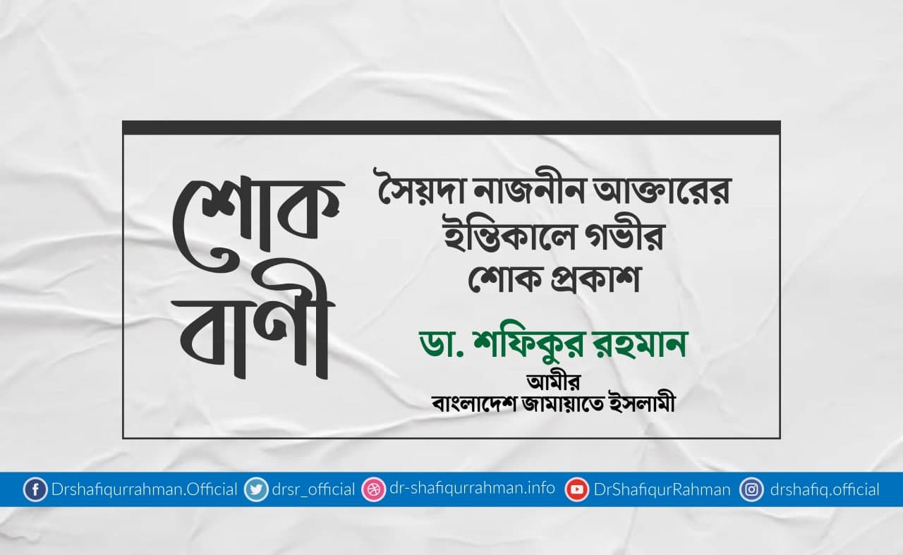 সৈয়দা নাজনীন আক্তারের ইন্তিকালে গভীর শোক প্রকাশ করে বাংলাদেশ জামায়াতে ইসলামীর আমীর ডা. শফিকুর রহমান ২৫ ডিসেম্বর ২০২০ এক শোকবাণী প্রদান করেছেন।