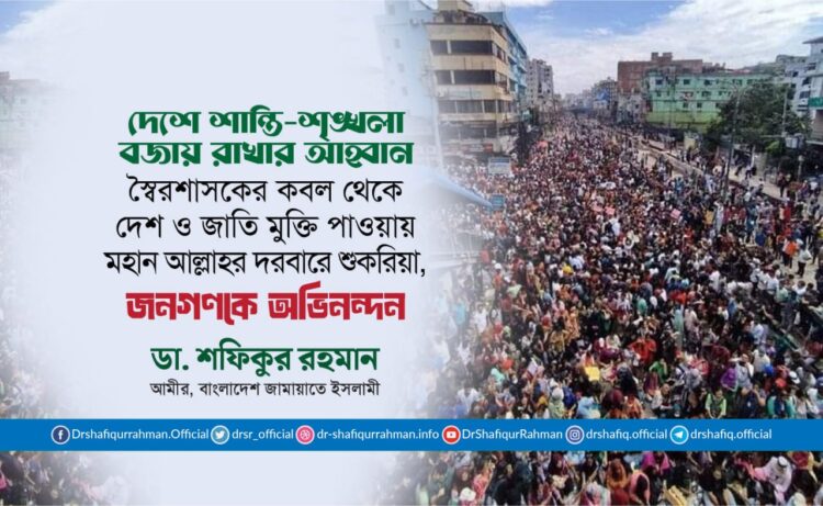 শতশত শহীদের রক্তের বিনিময়ে স্বৈরশাসকের কবল থেকে দেশ ও জাতি মুক্তি পাওয়ায় মহান আল্লাহর দরবারে শুকরিয়া, জনগণকে অভিনন্দন এবং দেশে শান্তি-শৃঙ্খলা বজায় রাখার আহ্বান জানিয়ে বাংলাদেশ জামায়াতে ইসলামীর আমীর ডা. শফিকুর রহমান ৫ আগস্ট প্রদত্ত এক বিবৃতিতে বলেন, “মহান আল্লাহর দরবারে লাখো কোটি শুকরিয়া যে, শতশত শহীদের রক্তের বিনিময়ে তিনি আমাদের প্রিয় বাংলাদেশকে স্বৈরশাসকের কবল থেকে মুক্ত করেছেন। আমি দেশের ছাত্রসমাজ, শিক্ষকসমাজ, সাংস্কৃতিক ব্যক্তিত্ব, সাংবাদিক, আইনজীবী, কবি-সাহিত্যিক, সুশীল সমাজ ও বিভিন্ন শ্রেণি পেশার মানুষ এবং রাজনৈতিক দলসমূহ এই আন্দোলনকে সফল করে তোলার জন্য যে অনন্য ভূমিকা রেখেছেন, এ জন্য আমি তাদের প্রতি কৃতজ্ঞতা প্রকাশ করছি।