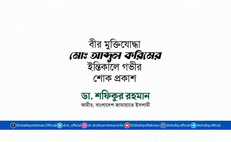 বীর মুক্তিযোদ্ধা মোঃ আব্দুল করিমের ইন্তিকালে গভীর শোক প্রকাশ করে বাংলাদেশ জামায়াতে ইসলামীর আমীর ডা. শফিকুর রহমান ২৮ নভেম্বর এক শোকবাণী প্রদান করেছেন।