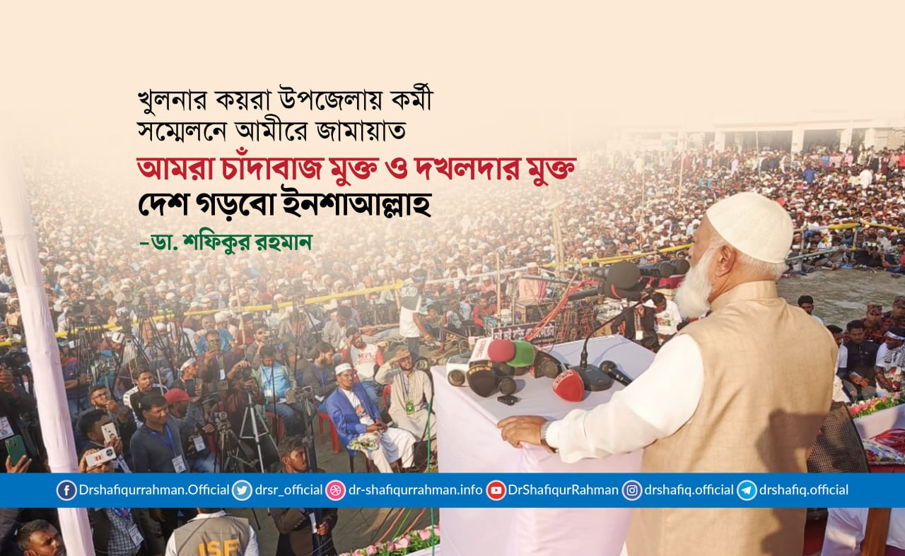তিনি আজ বৃহস্পতিবার ২৬ ডিসেম্বর বিকেলে খুলনা জেলার কয়রা উপজেলার কপোতাক্ষ কলেজ ময়দানে অনুষ্ঠিত কর্মী সম্মেলনে প্রধান অতিথির বক্তব্যে এসব কথা বলেন। উপজেলা আমীর মাওলানা মোক্তার হোসাইনের সভাপতিত্বে এবং সেক্রেটারি মাওলানা শেখ সিরাজুল ইসলামের পরিচালনায় সামবেশে বিশেষ অতিথি ছিলেন বাংলাদেশ জামায়াতে ইসলামীর সেক্রেটারি জেনারেল ও সাবেক এমপি অধ্যাপক মিয়া গোলাম পরওয়ার, কেন্দ্রীয় নির্বাহী পরিষদ সদস্য জনাব মোবারক হোসাইন, কেন্দ্রীয় সাংগঠনিক সেক্রেটারি ও খুলনা অঞ্চল পরিচালক মুহাদ্দিস আব্দুল খালেক, কেন্দ্রীয় কর্মপরিষদ সদস্য ও খুলনা অঞ্চলের সহকারী পরিচালক মাওলানা আবুল কালাম আজাদ, খুলনা জেলা আমীর মাওলানা এমরান হুসাইন, সাতক্ষীরা জেলা আমীর মাওলানা শহিদুল ইসলাম মুকুল।
