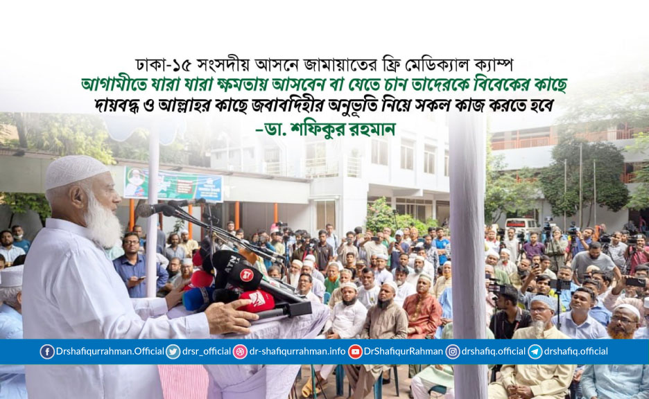 তিনি আজ সকাল ১০.৩০টায় রাজধানীর মনিপুর স্কুল এন্ড কলেজ, ইব্রাহিমপুর, ব্রাঞ্চ-০২-এলাকায় ঢাকা-১৫ সংসদীয় আসনের কাফরুল থানা দক্ষিণ আয়োজিত ফ্রি মেডিকেল ক্যাম্পে প্রধান অতিথির বক্তব্যে এসব কথা বলেন। থানা আমীর অধ্যাপক আনোয়ারুল করিমের সভাপতিত্বে এতে বিশেষ অতিথির বক্তব্য রাখেন কেন্দ্রীয় কর্মপরিষদ সদস্য ও ঢাকা মহানগরী উত্তরের নায়েবে আমীর আব্দুর রহমান মূসা। উপস্থিত ছিলেন ঢাকা মহানগরী উত্তরের কর্মপরিষদ সদস্য মো. শহিদুল্লাহ, শাহ আলম তুহিন প্রমূখ।