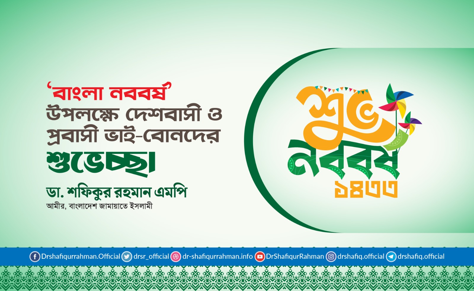‘বাংলা নববর্ষ’ উপলক্ষে দেশবাসী ও প্রবাসী ভাই-বোনদের শুভেচ্ছা জানিয়ে মাননীয় বিরোধীদলীয় নেতা এবং বাংলাদেশ জামায়াতে ইসলামীর মুহতারাম আমীর ডা. শফিকুর রহমান এমপি আজ ১৩ এপ্রিল এক বিবৃতি প্রদান করেছেন।
